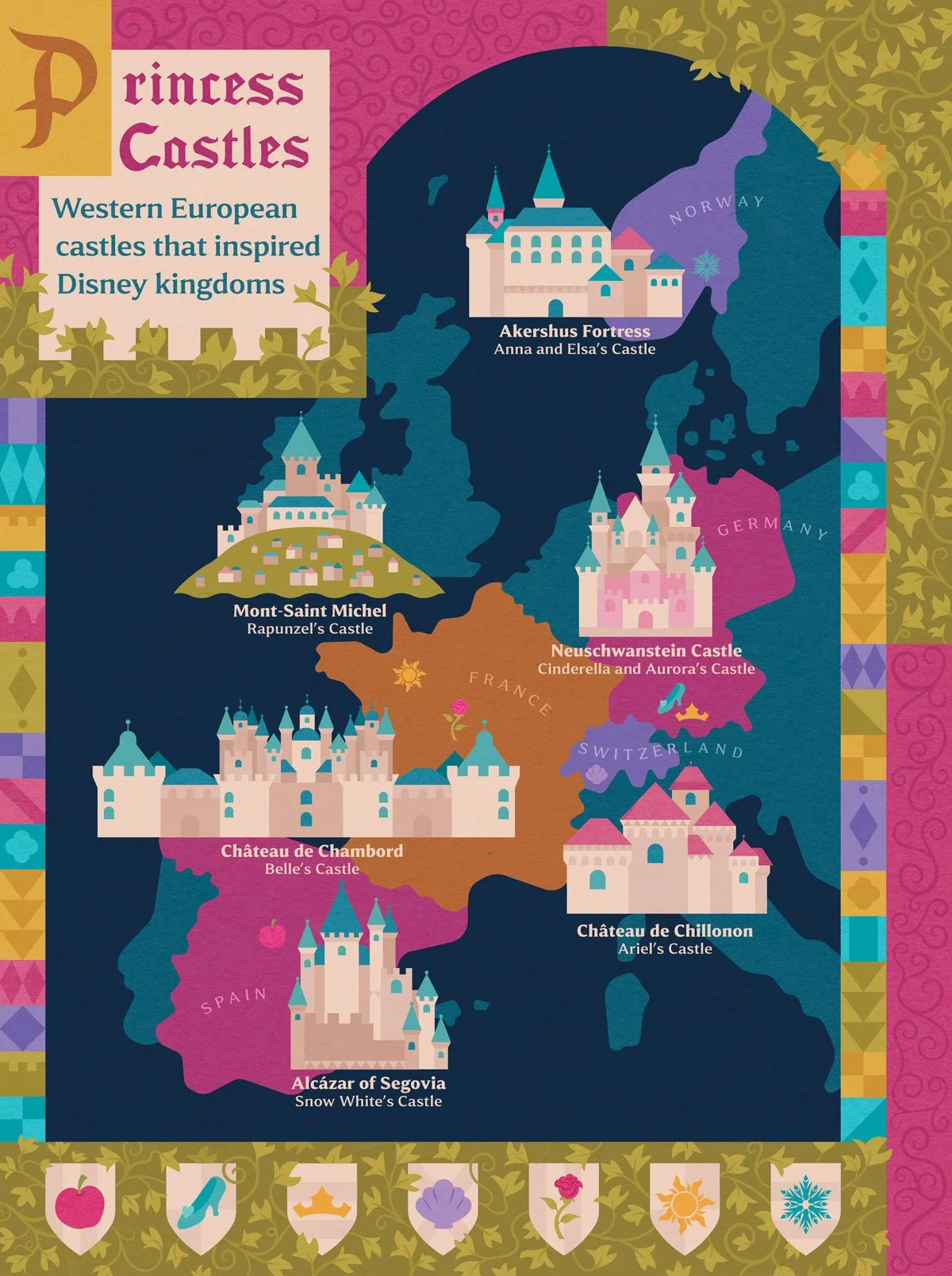 Created a map of Western European castles that served as the inspiration for the castles in Disney Princess films. Locations include: Akershus Fortress, Mont-Saint Michel, Neuschwanstein Castle, Chateau de Chambord, Chateau de Chillonon and the Alcazar of Segovia. Project was made fully in Adobe Illustrator. Spring 2026.
